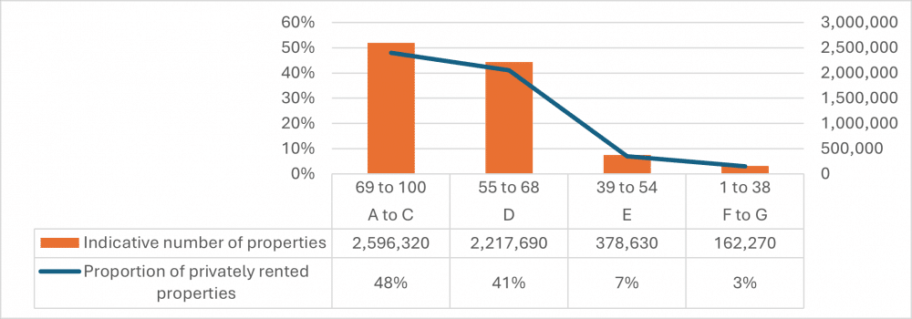 For D‑rated properties, which make up 41% of the privately rented stock, we suggest a split of the current band into two sub‑bands: